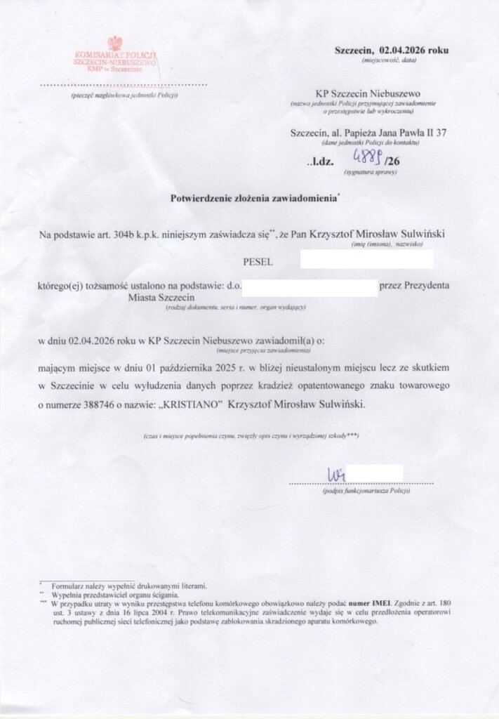 Pierwszym krokiem, jaki zrobiłem po spotkaniu z Krzyśkiem, było udanie się na policję w celu złożenia zawiadomienia o popełnieniu przestępstwa. Zawiadomienie zakwalifikowano jako wyłudzenie danych poprzez kradzież opatentowanego znaku towarowego. Miało to miejsce 2-ego kwietnia. Spędziłem na niej trzy godziny.